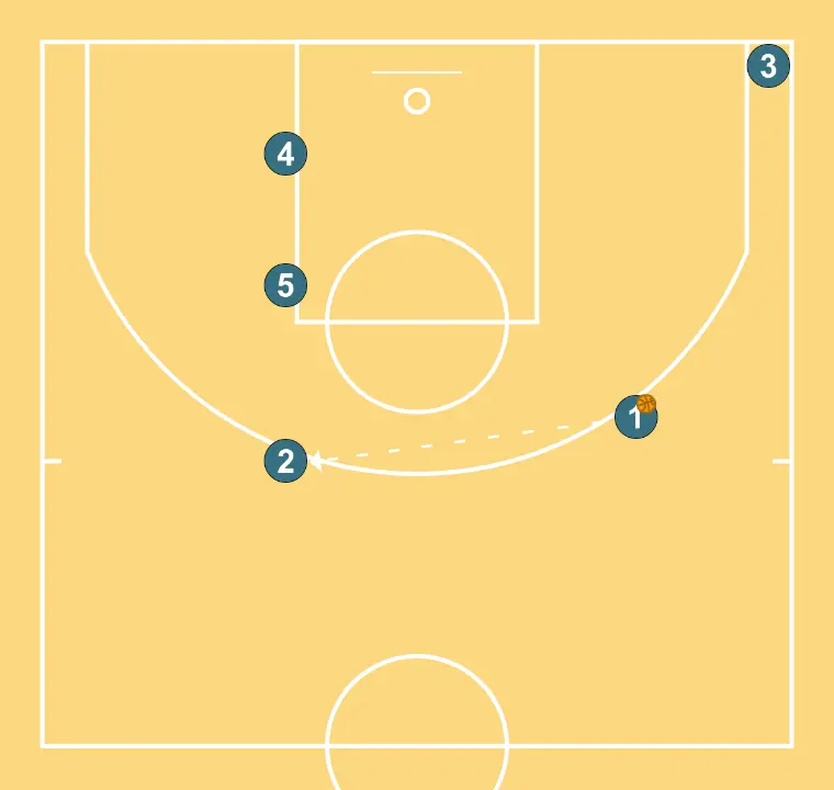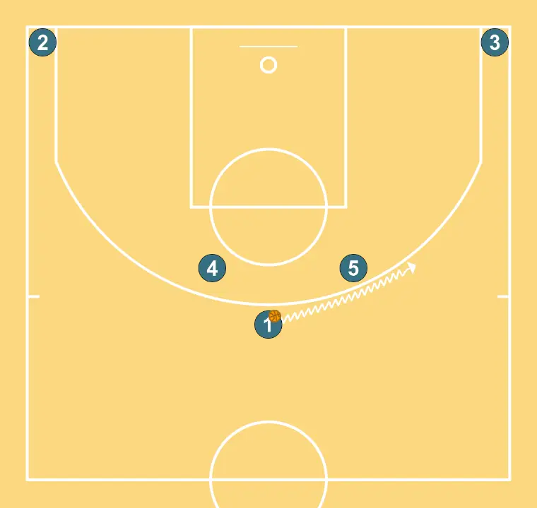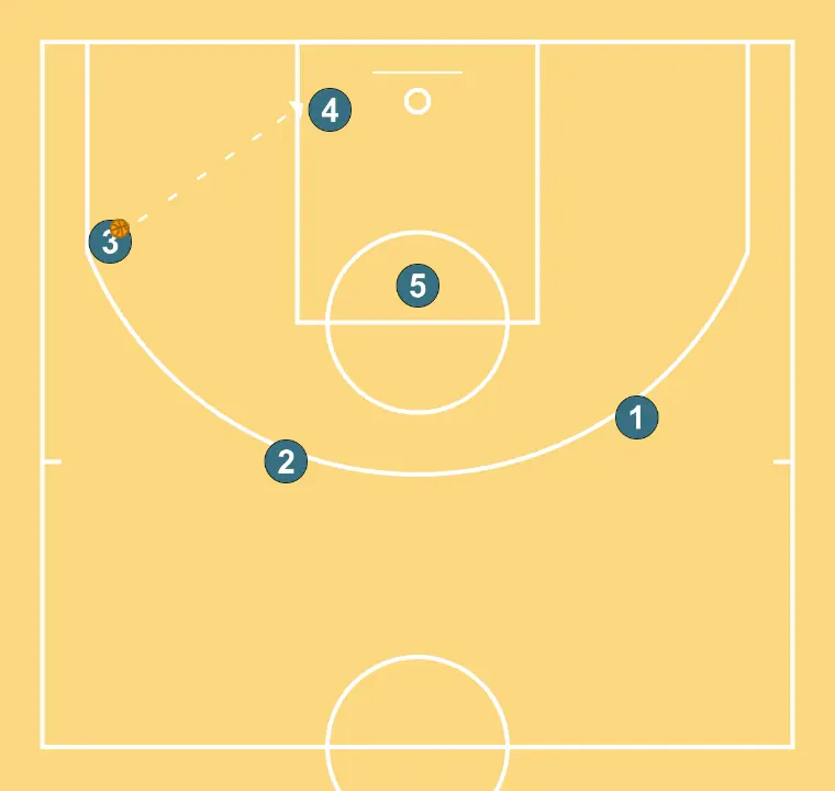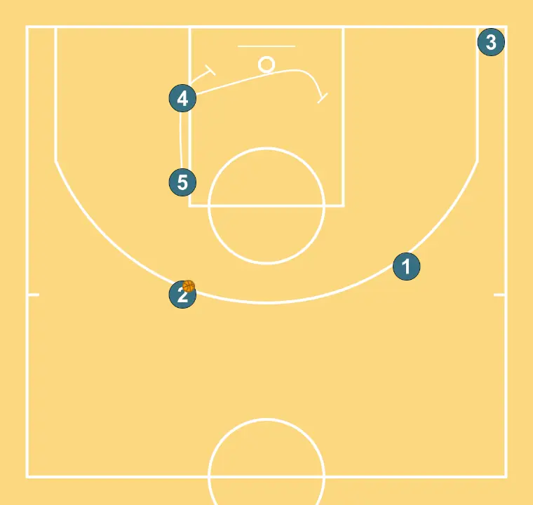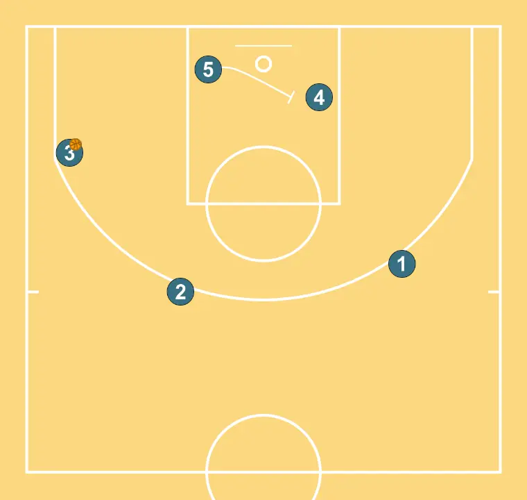 4 establishes a screen to create advantage and confuse the defense. Center blocks the defender, opening space for cuts, drives, or shots.