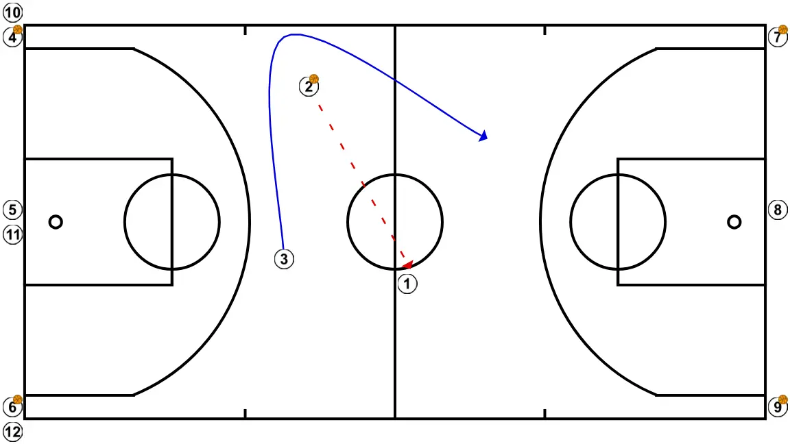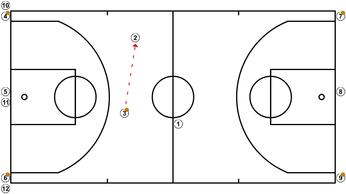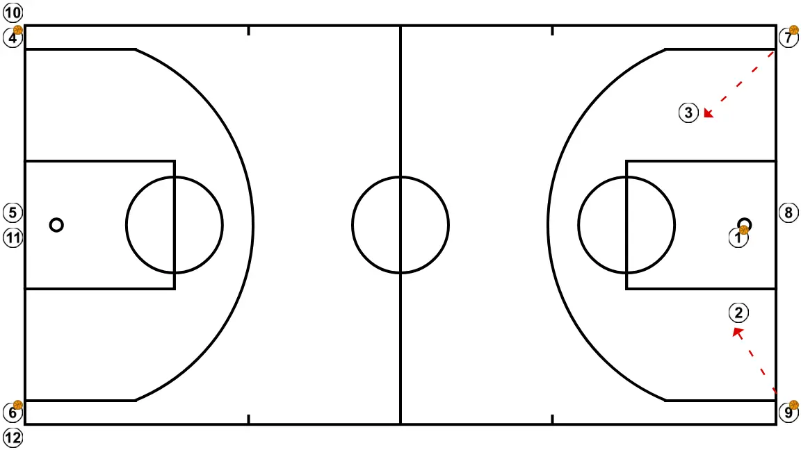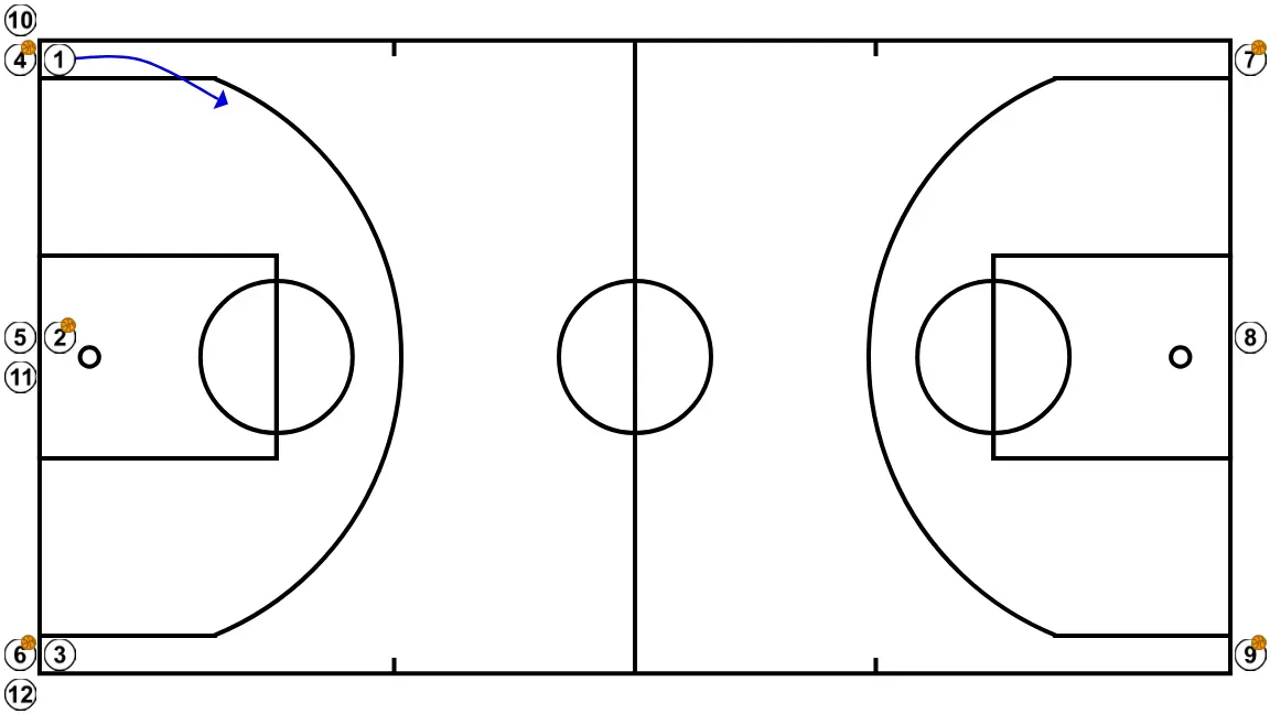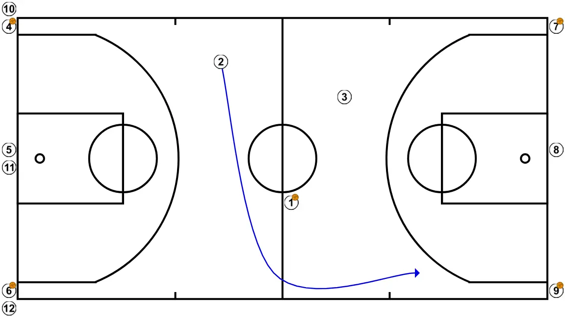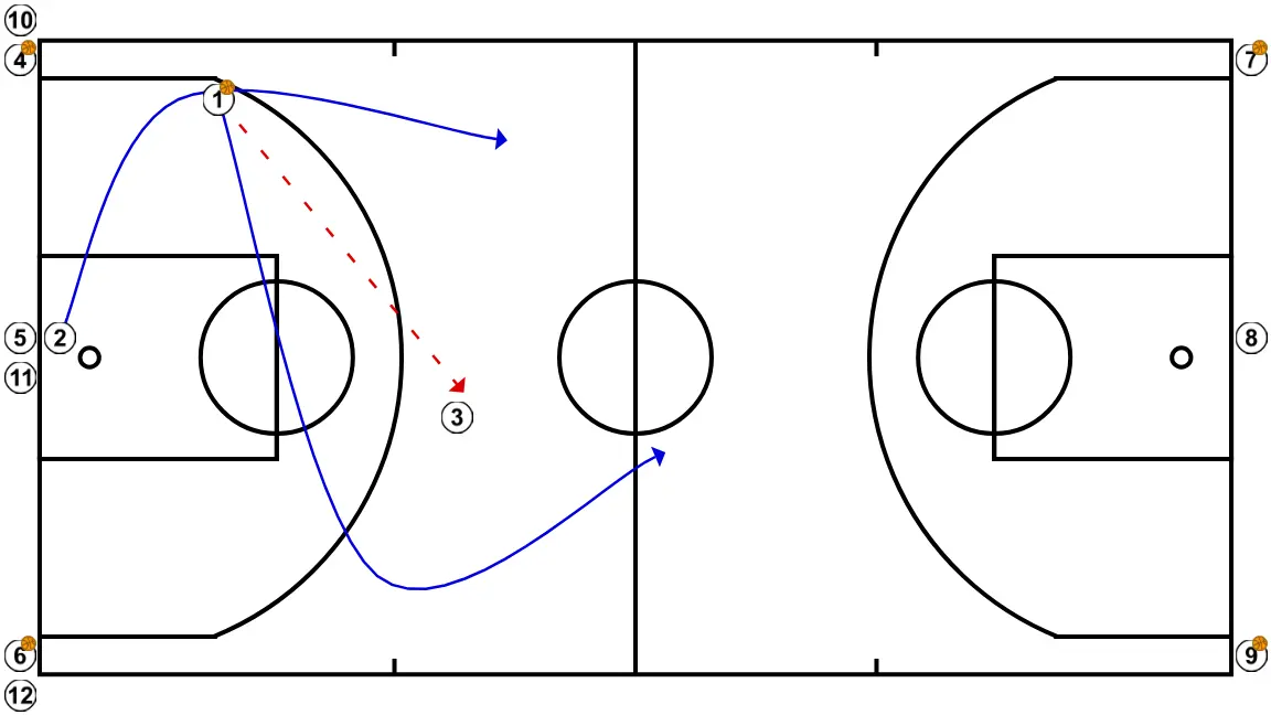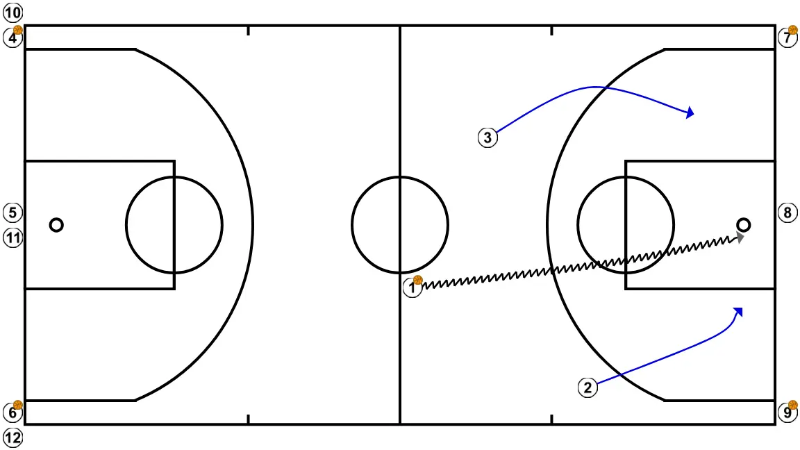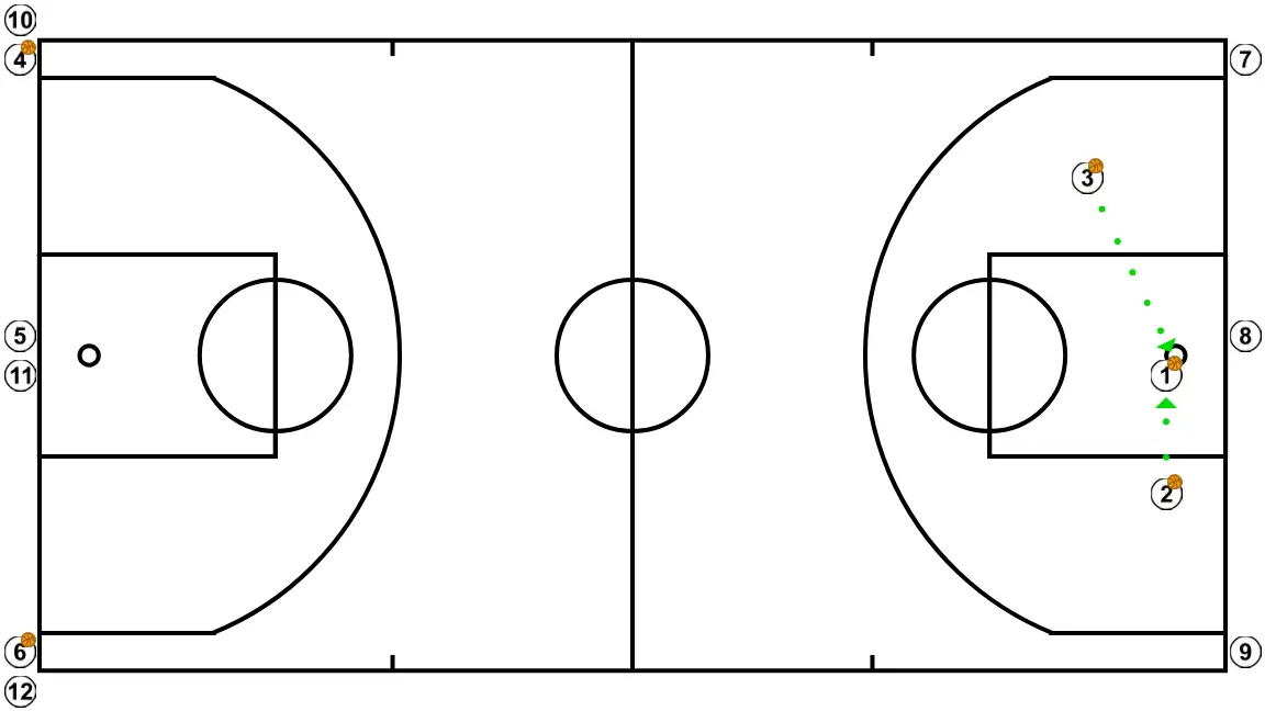 Shooting guard moves to support teammates and maintain constant game flow. 1 moves strategically to provide new passing lanes and open space.
