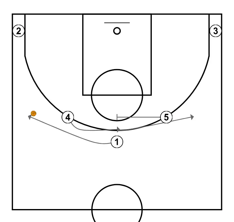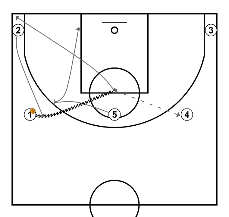 Point guard changes location seeking advantage over the defender and scoring opportunities. Power forward shifts to an optimal spot on the court to maximize offensive efficiency. 5 plants a screen to improve attack angle and facilitate ball reception. 4 shifts to an optimal spot on the court to maximize offensive efficiency.