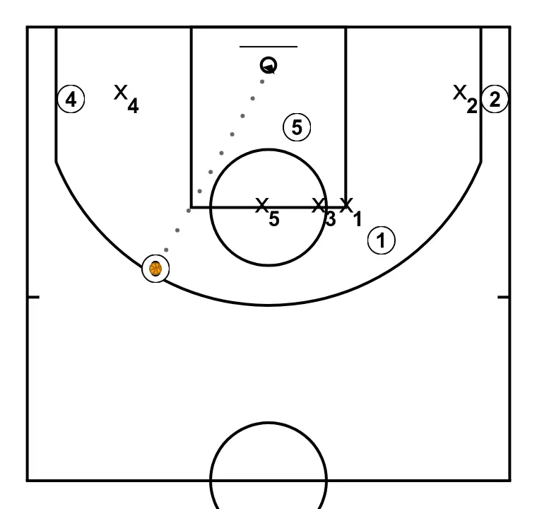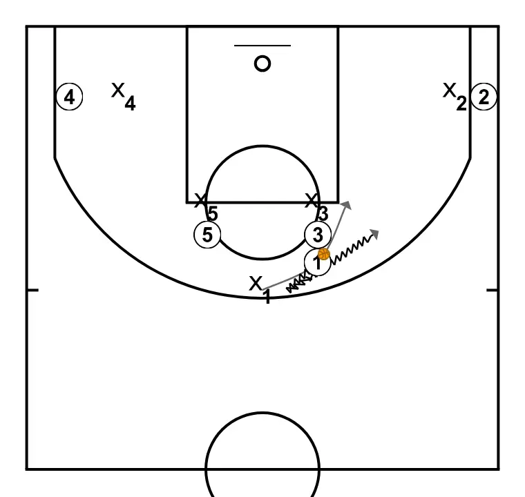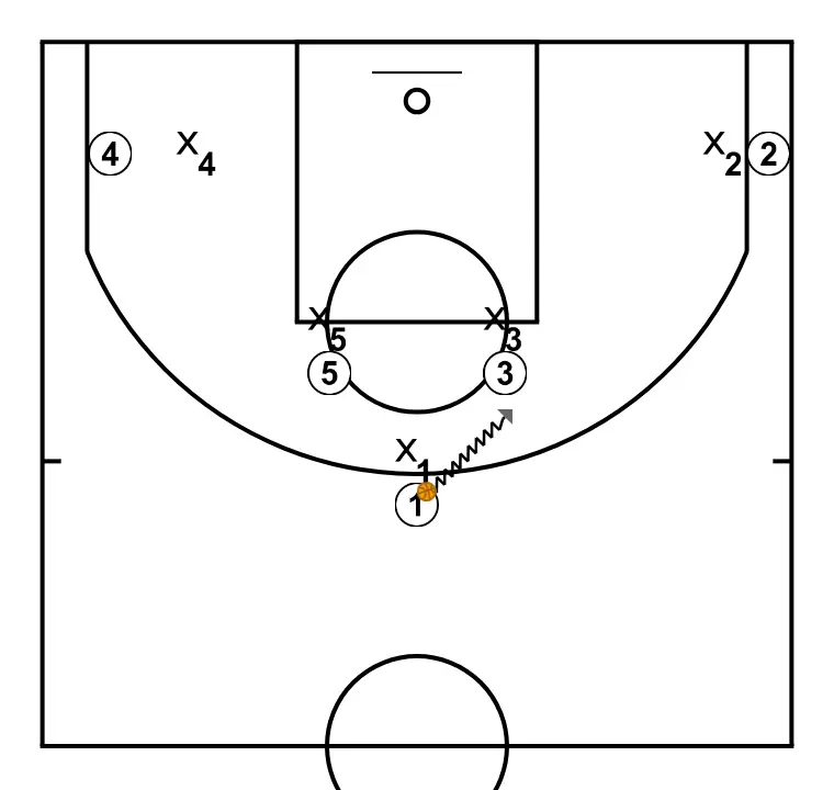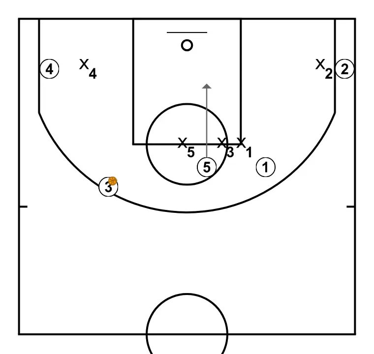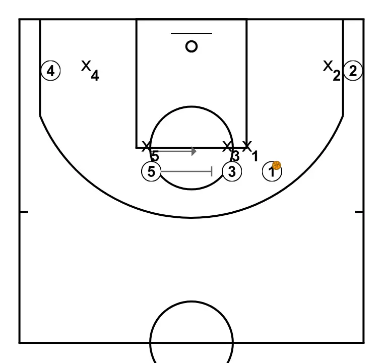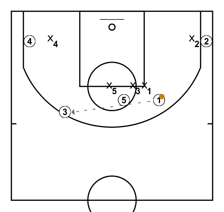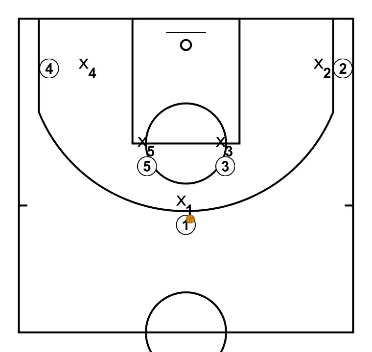 Point guard in the center with the ball. The center and shooter forward position to set a double screen. The point guard exits the screen from the shooter’s side, cutting to the opposite side and receiving a screen from the center to look for a free shot. Finally, the center cuts looking for a pick and roll. The other two players stand in the corners ready to receive and shoot.