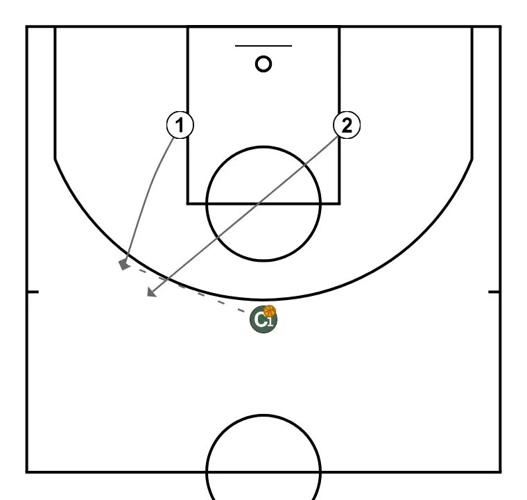 Players 1 and 2 are positioned as indicated in the diagram, ensuring they are active on their feet and have a good defensive posture. At the coach's signal, they will perform the corresponding action. In this case, if the coach says “1”, player 1 becomes the attacker and player 2 becomes the defender; if the coach says “2”, the roles are reversed. The attacker must step out of the 3-point line to receive and initiate the 1x1 situation. The defender must close out to defend the attacker properly.