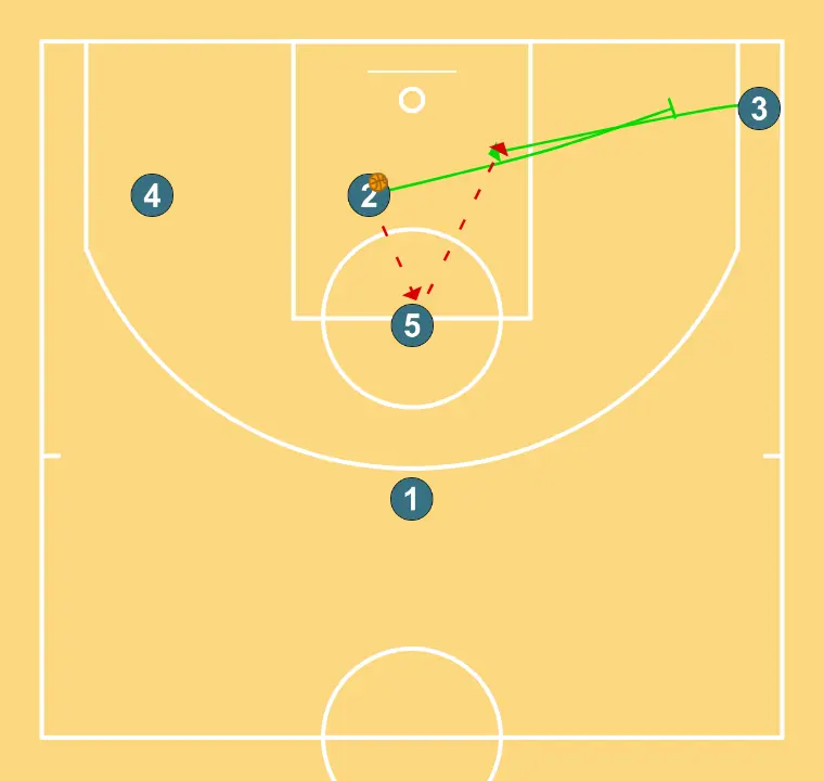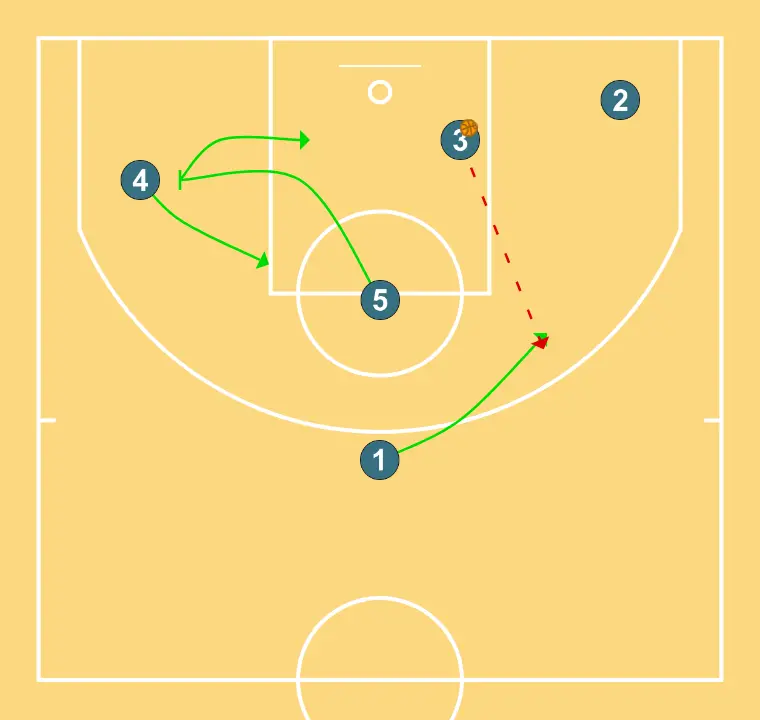 We counter and switch to 4-1, but with one high. When we pass the ball to 1, set up corners and 45, then start options.
