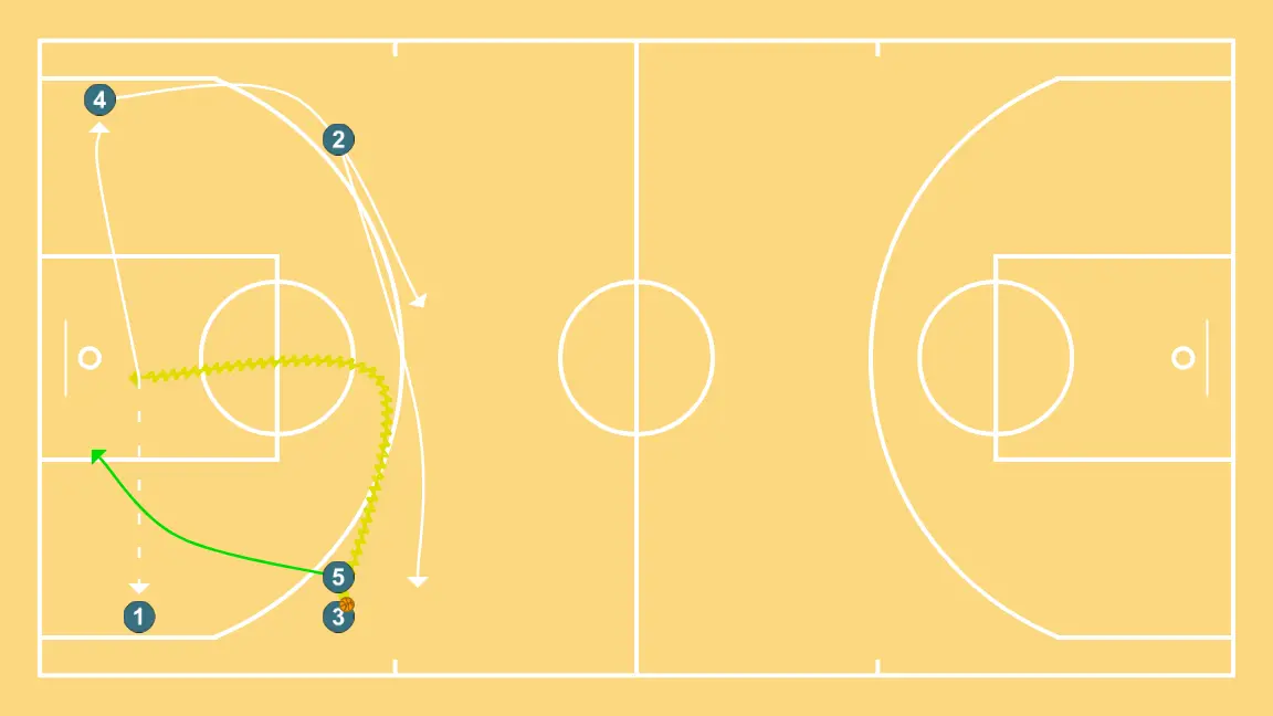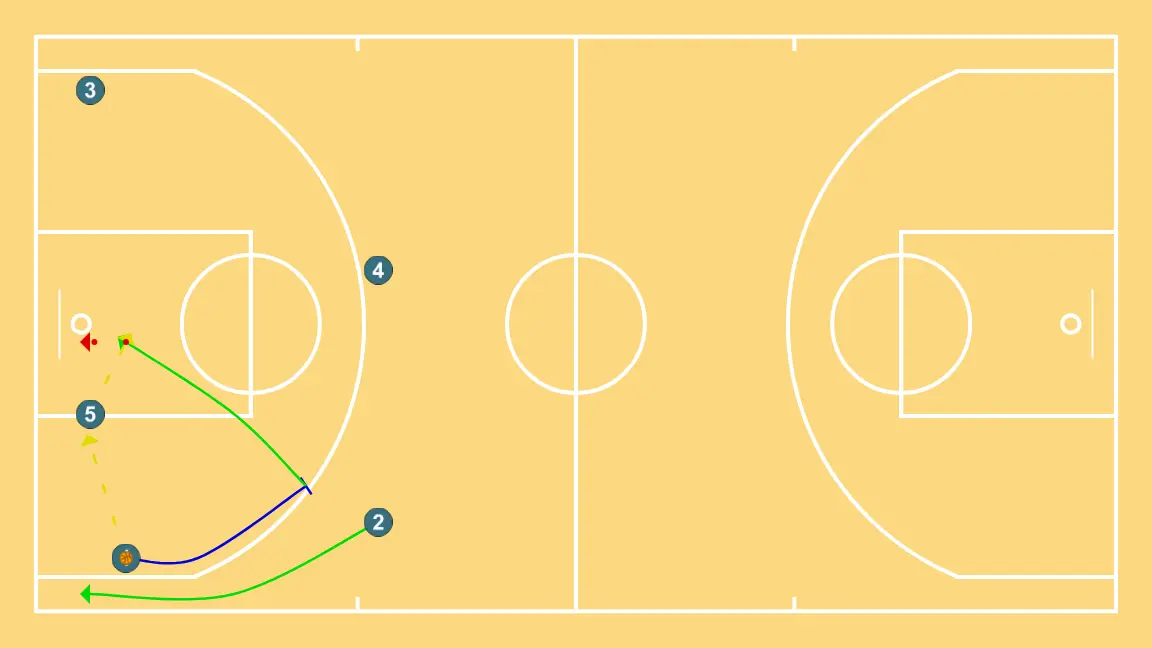 Power forward blocks the defender, opening space for cuts, drives, or shots. 2 alters position to create defensive mismatches and penetration options. 1 performs a tactical screen causing mismatches in the opponent’s defense. 3 adjusts position to facilitate ball movement and anticipate the defense. 5 performs a tactical screen causing mismatches in the opponent’s defense.