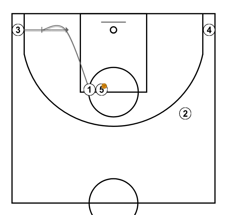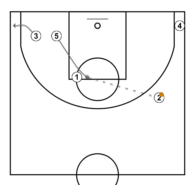 1 passes to 2 and cuts through the middle to set an off-ball screen for 5, who moves to the free-throw line, receives from 2, and shoots.