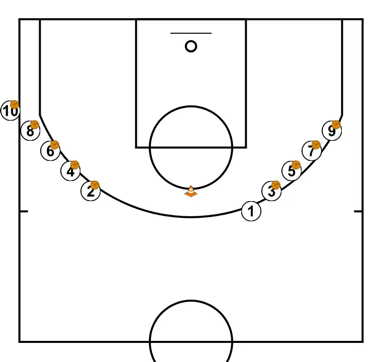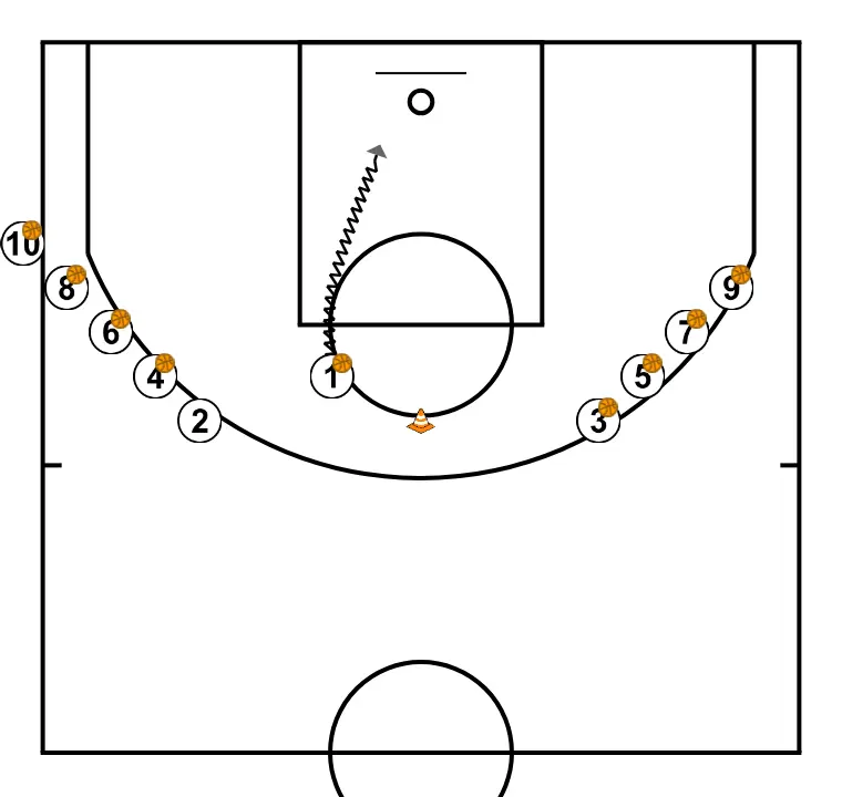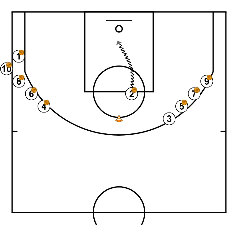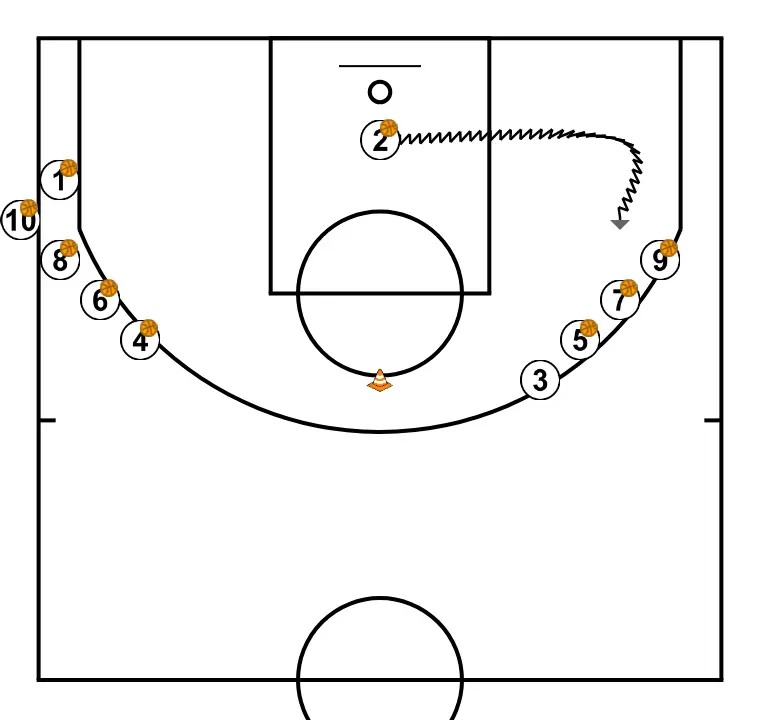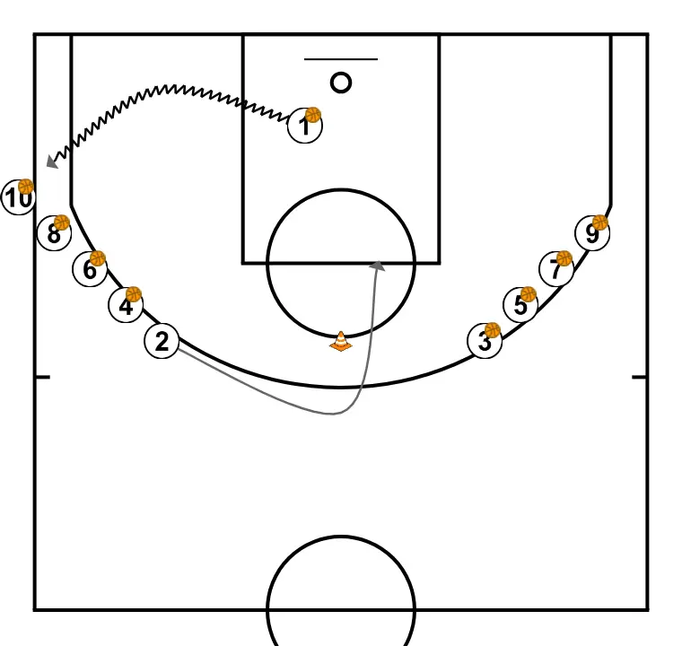 1 rodea el cono recibe el pase de 2 y finaliza con una entrada a canasta por la izquierda. 2 despues del pase rodea el cono, y realiza una entrada por la derecha.