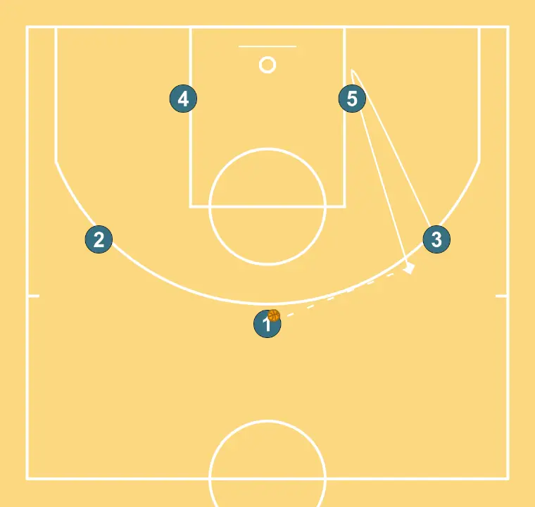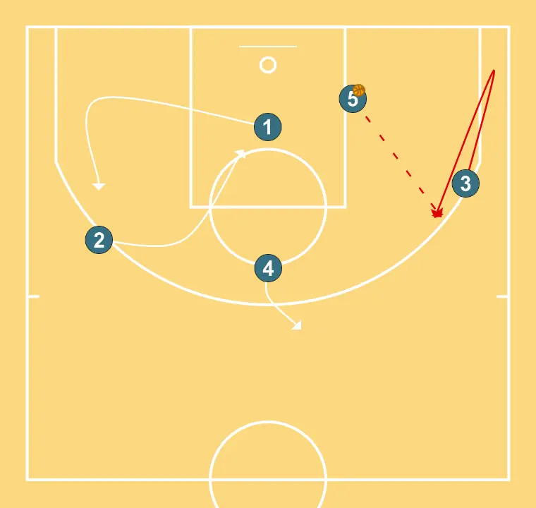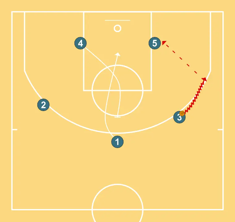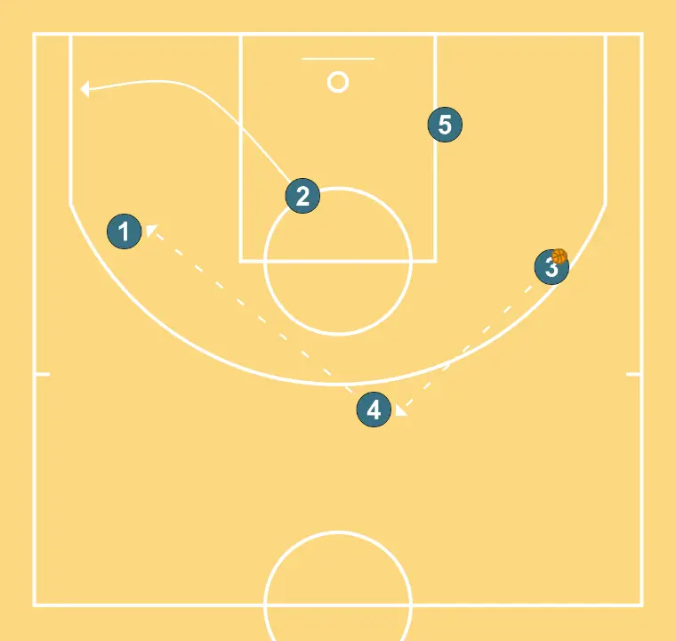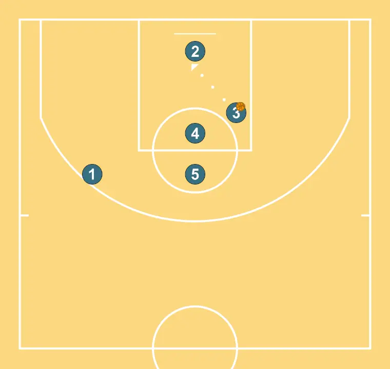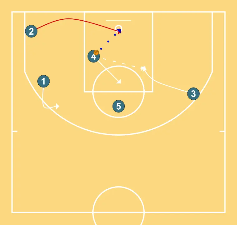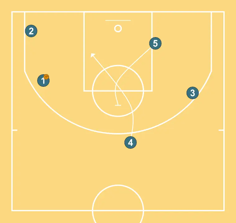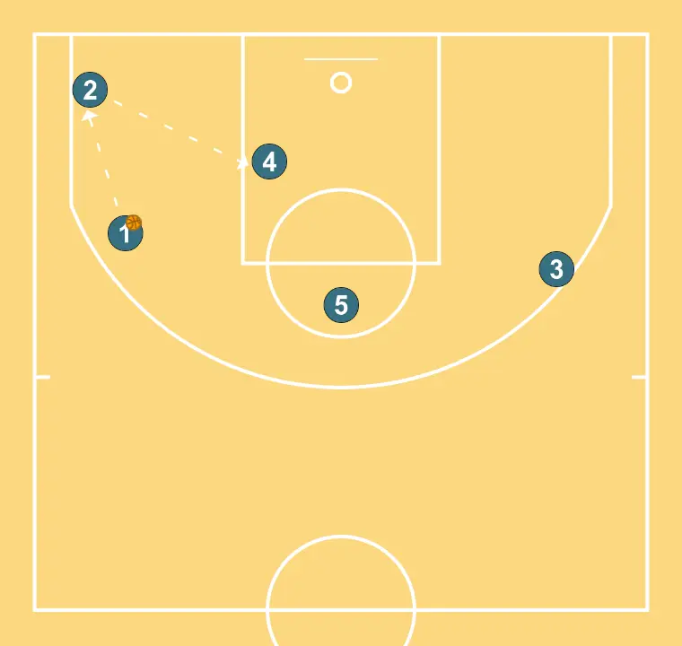 Half-court play generating close-range shooting and cutting options with active ball exchanges and multiple scoring options.