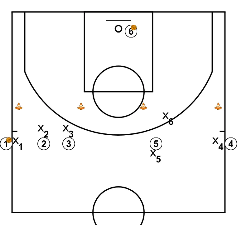 Duelo de fintas. Dos equipos con varios jugadores cada equipo. Un pasador de cada equipo y el resto de jugadores tienen que hacer fintas para recibir cuanto antes y entrar a canasta. Gana el equipo que meta antes.