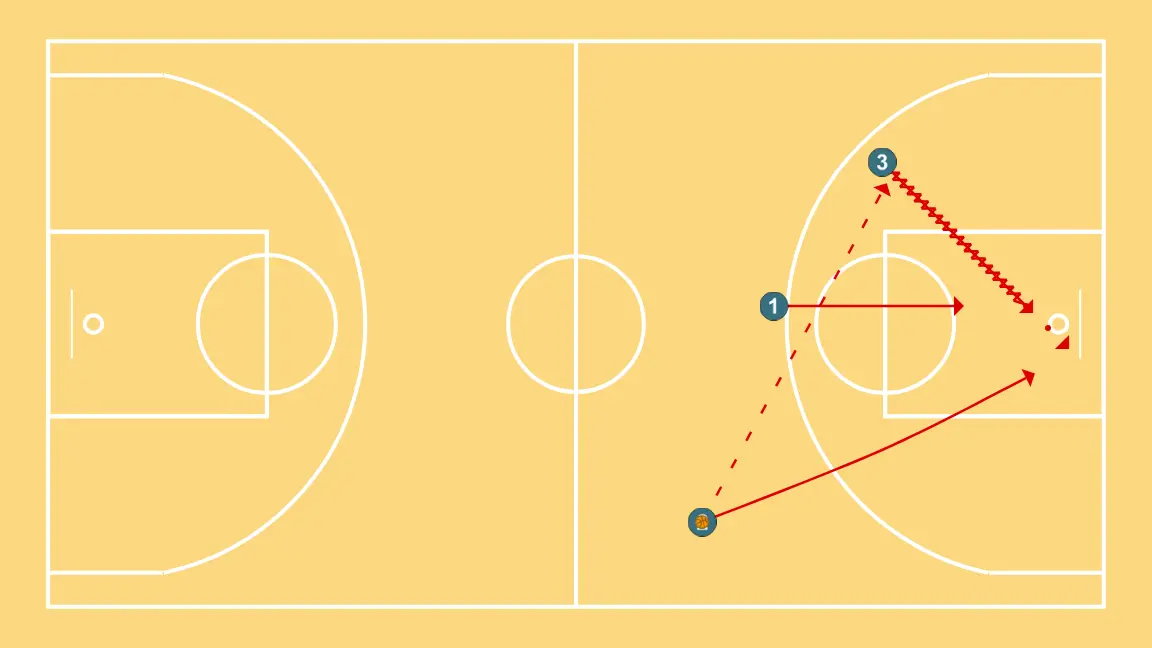 3x0 fast break drill twisted with one way, the return is performed by the players outside the court while the next trio performs the drill, it can be done with or without a bounce. Very interesting exercise for the beginning of the training session as part of the warm-up