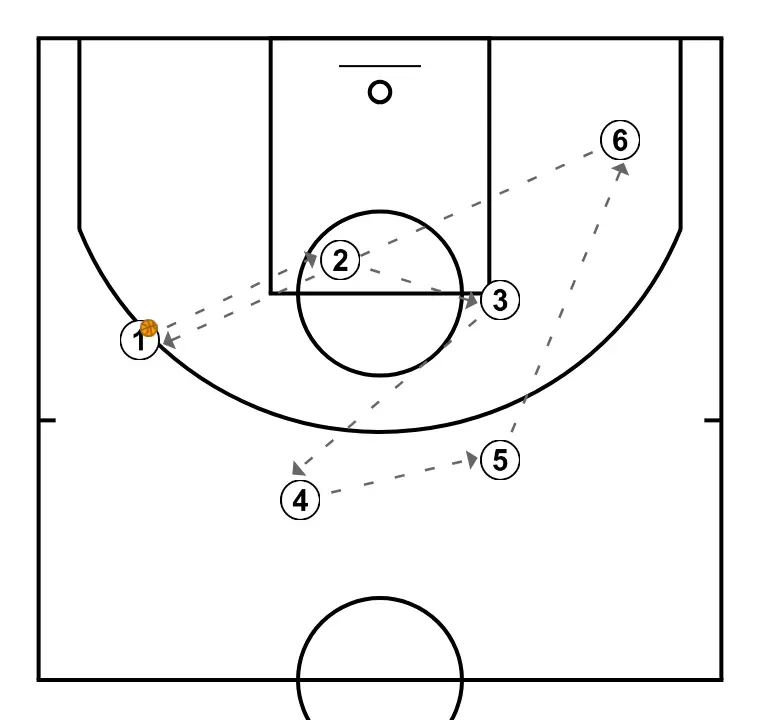Six players, numbered 1 to 6, pass the ball around a given space with the rule that you pass to the next number and receive from the previous one. Each time you pass, you have to move to a different space. You start with one ball but then you introduce a second and a third. A good exercise to work on children's attention to various stimuli.