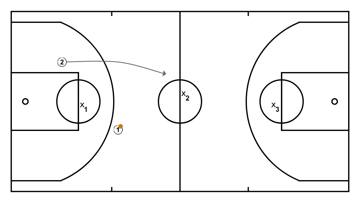 Two players start from the baseline and must reach the basket by passing from one basket to the other, avoiding both losing the ball due to a bad pass or a bad reception and one of the players in one circle touching it. If this happens, the player who lost the ball replaces the player in the circle.