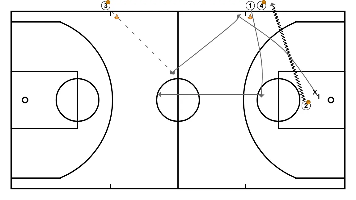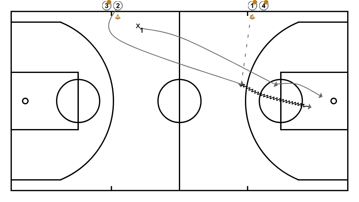 This basketball drill is designed to work on the 1-on-1 in a very complete manner. This is because it works on it before the reception, which also forces players to win the passing lanes and be able to attack after receiving, as in a game situation. This exercise, if done with few players (4 players or 8 players distributed on both sides), has considerable intensity. The ideal number of players is 4-5 per side (it can be worked on both sides). It's ideal for warm-ups, as you can incorporate a competitive component with a winner and a punishment for the rest.